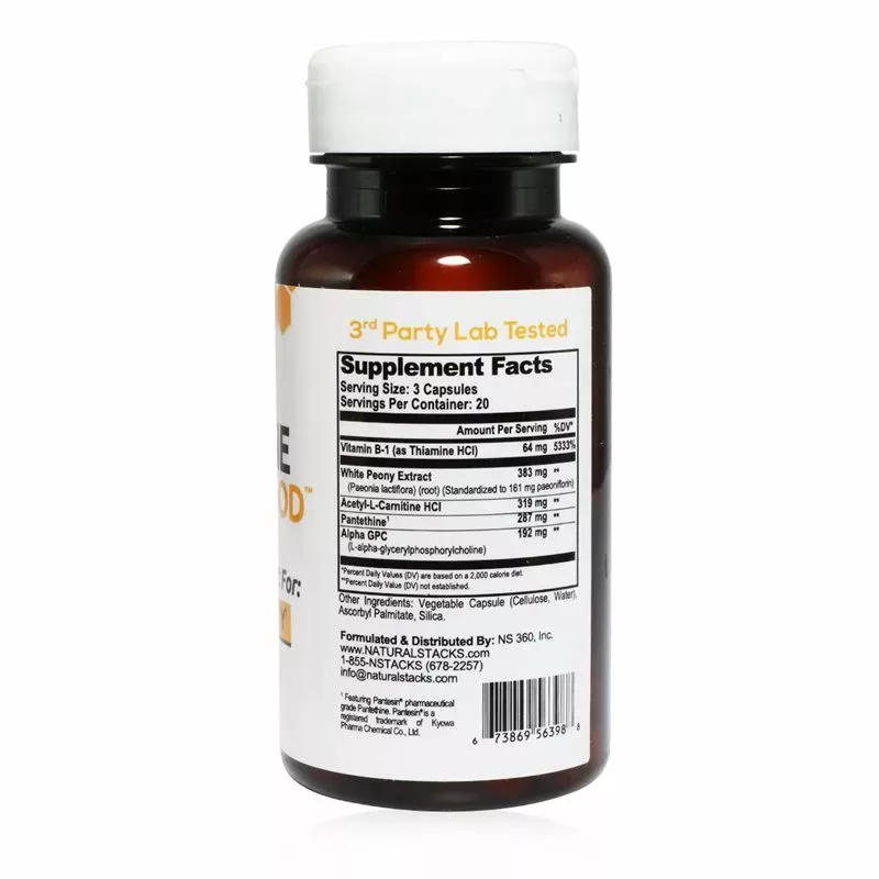 Vitamin B1, taking the form of Thiamine HCL, is included to increase the production of acetyl-CoA molecules in the brain. These are necessary molecules used to provide acetyl groups to the enzyme Choline Acetyltransferase (ChAT) so it can produce the acetylcholine neurotransmitter.