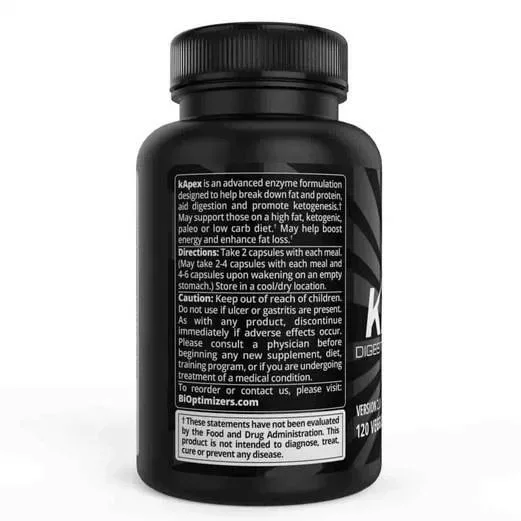 A combination of digestive enzymes and substances appropriate for a ketogenic or low-carbohydrate diet are included in BiOptimizers kApex. The components consist of: