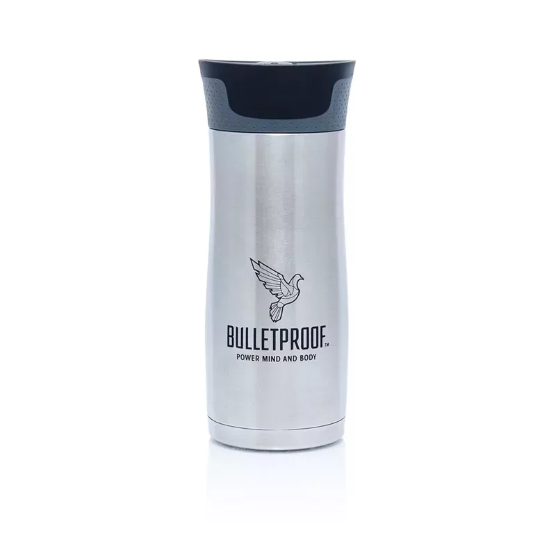 Never spill another drop with this 100% spill and leak-proof travel mug. Press the AUTOSEAL button to sip, and release the button to automatically reseal. This self-sealing lid technology is combined with a double-wall, vacuum-insulated, stainless steel mug, providing exceptional temperature retention. Your Bulletproof Coffee will stay hot for 4 hours or cold for 12 hours. Take your Bulletproof Coffee with you on the go, and live Bulletproof wherever you are.