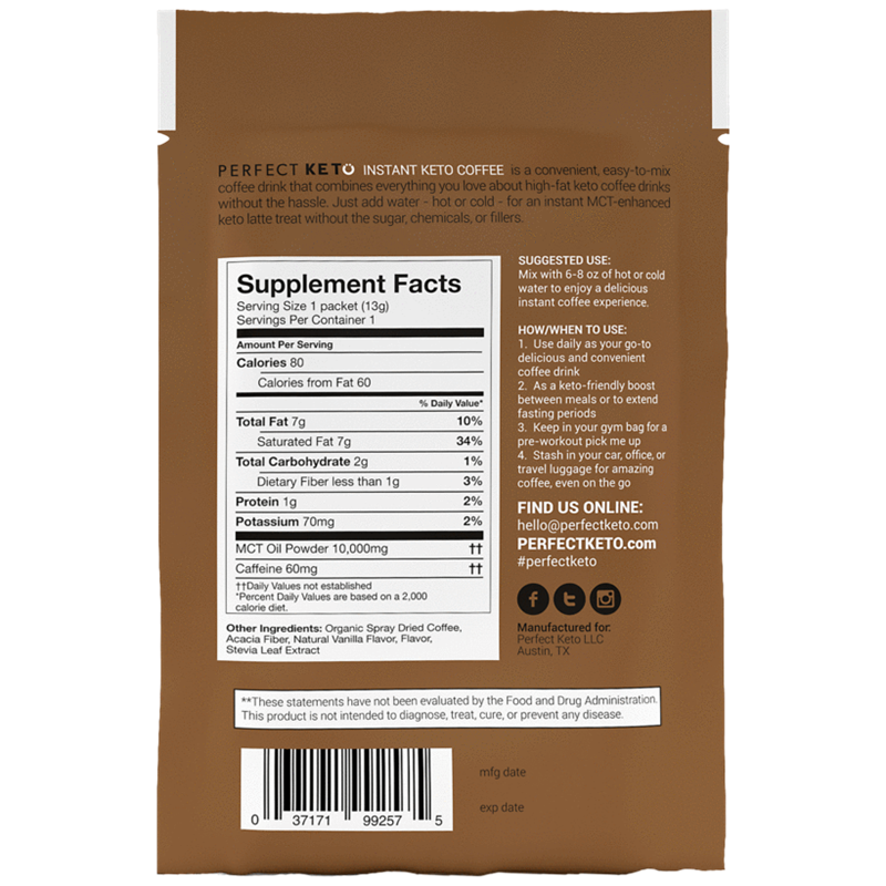 Similarly, you don’t always want to be carrying around MCT oil with you in order to make keto-friendly coffee at work or anywhere else for that matter. That’s why Perfect Keto have developed their Instant Coffee sachets with two incredible flavours to choose from. Save yourself the hassle of going to extraordinary lengths to get a decent cup of keto-friendly coffee and simply add water to enjoy all of the benefits of organic coffee fortified with MCT oil.