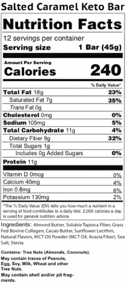 Perfect Keto Salted Caramel Snack Bars have been made with real food ingredients including almond butter, organic coconut oil, organic cocoa, stevia and allulose, sunflower lecithin, grass-fed collagen and tapioca fibre making them naturally sweet, tasty and filling.