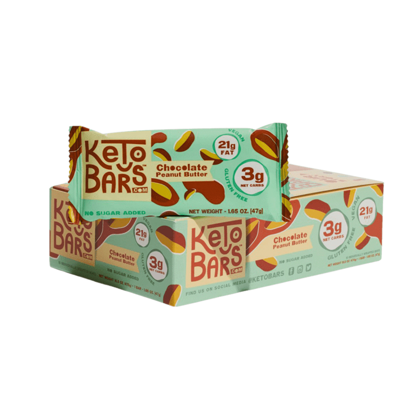 Each pack contains 12 individual Keto Bars now available in chocolate peanut butter, dark chocolate coconut almond, mint chocolate and chocolate covered strawberry flavours.