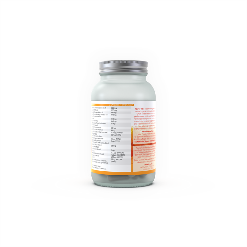 Power Up: Day Time does not contain caffeine or any stimulants, instead it is made from nootropic ingredients derived from genuine food. Nootropics are substances that can improve mental performance in healthy people, they are often utilised to optimise focus, productivity, and memory. Power Up: Day Time offers a specially formulated gluten-free mix of nootropics that is suitable for vegans and vegetarians. These supplements can easily be added to your daily routine, simply take 2 capsules in the morning washed down with water for a day of enhanced brain performance.