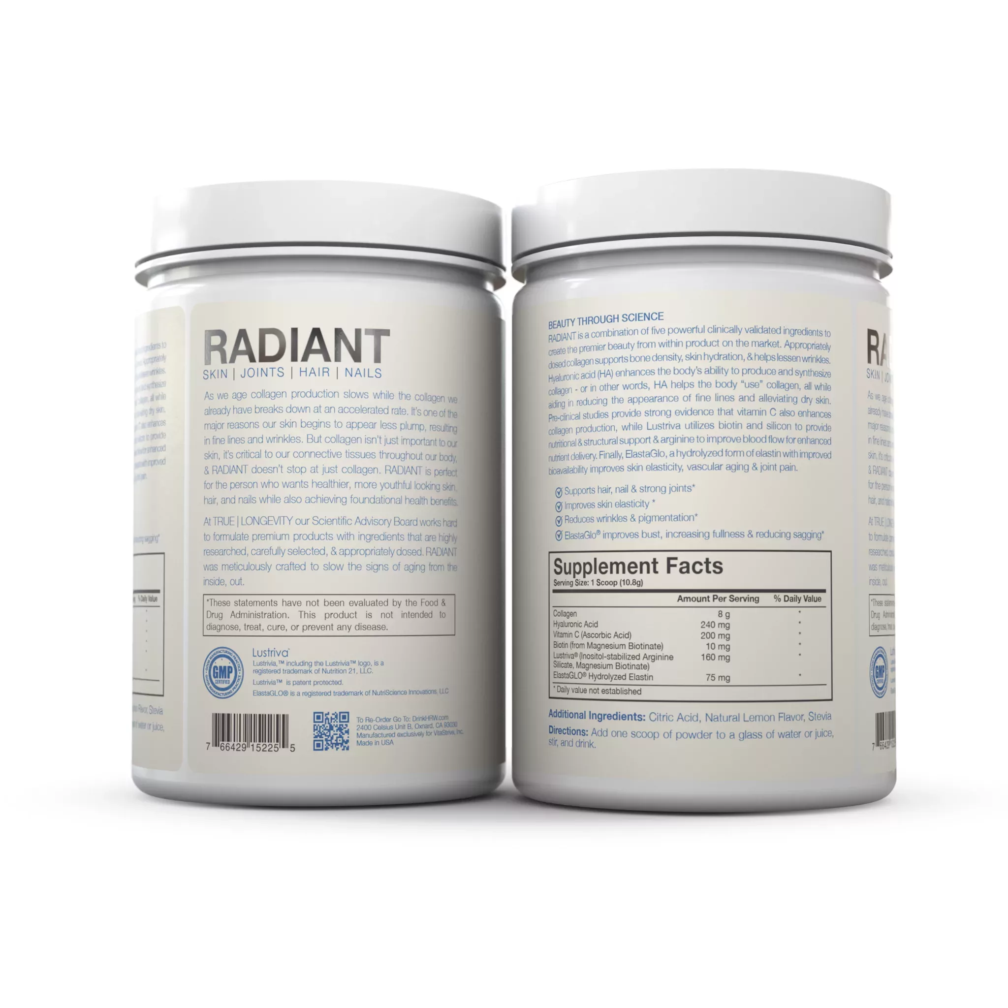 • TRUE | LONGEVITY RADIANT includes Collagen, Hyaluronic Acid (HA), ElastaGlo, Lustriva, and Vitamin C.